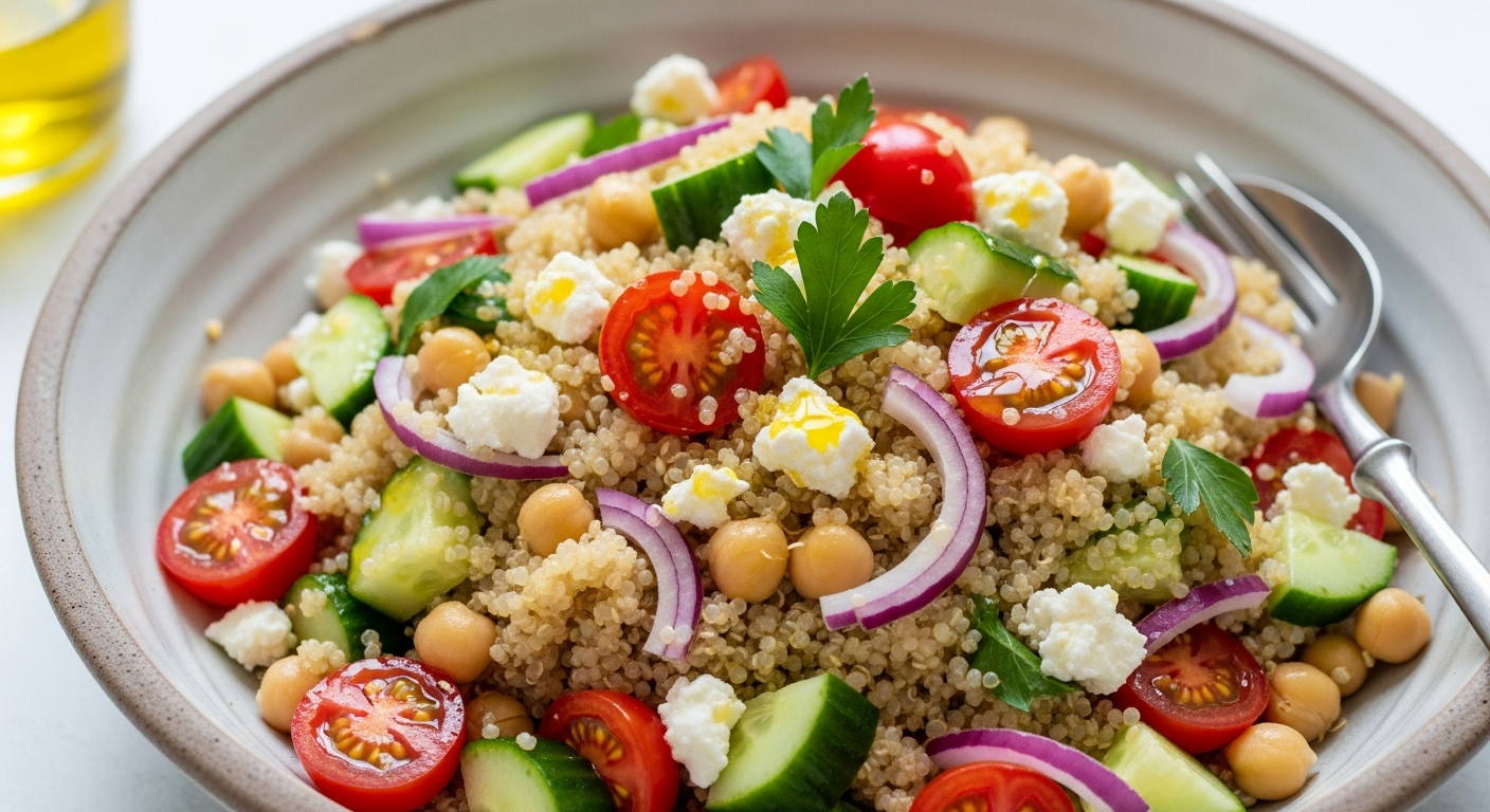 In a large bowl, combine cooked quinoa, cucumber, orange segments, and red bell pepper.